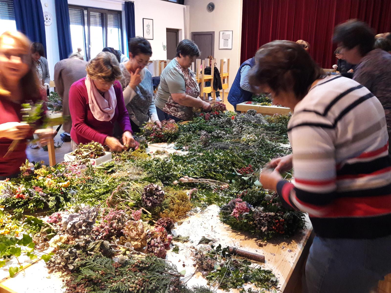 Unter der Leitung von Christa Barkowski konnten 28 Teilnehmer aus der Vielzahl von getrockneten Blüten und Pflanzen Herbstkränze binden. Jede, egal ob Erfahrene oder Anfängerin ging am Ende des Kurses mit einem wunderschönen Exemplar nach Hause.