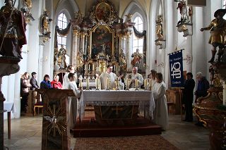 Beginnend mit einem Festgottesdienst in der Pfarrkirche, musikalisch vom Kirchenchor gestaltet, wurde ein symbolisches Licht entzündet, für jedes Jahrzehnt eine Kerze vor dem Altar. Bischöflich Geistlicher Rat Stephan Heindl begrüßte die Frauenbundmitglieder aus Essenbach und den benachbarten Zweigvereinen Ahrain, Altheim, Mettenbach und Mirskofen mit ihren Fahnenabordnungen.
